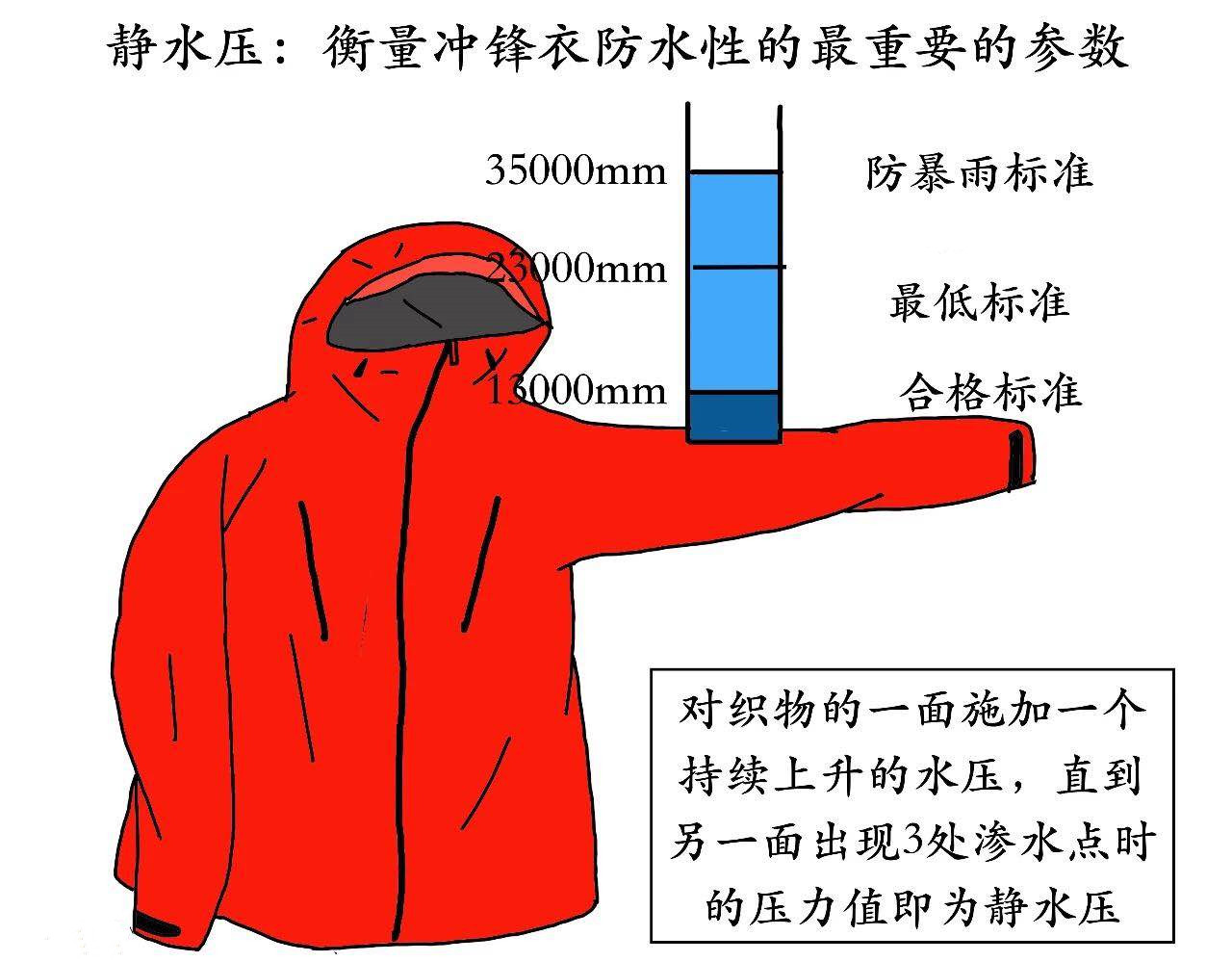 沖鋒衣的防水性能的重要參數(shù)—靜水壓。很多山友們認為把水潑在沖鋒衣上,不漏水就說明防水,這個檢驗方法是錯誤的!其實,除了水的自然滲透,外界施加的壓力也會迫使水穿透面料。而沖鋒衣的靜水壓的高低即可標識它抵抗被水穿透的能力。