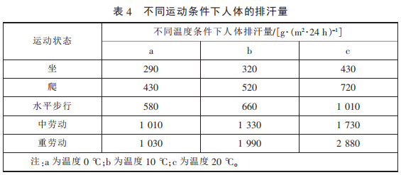 GB/T 32614—2016 中 功 能 性 指 標(洗 前)與 GB/T 21295—2014 《服裝理化性能的技術(shù)要求》對比 可知,GB/T 32614—2016 中對于拒 水、耐靜水壓和透濕率 3 項功能性 要求更高,尤其是Ⅰ類產(chǎn)品的耐靜 水壓和透濕率遠高于 GB/T 21295— 2014 的技術(shù)要求。兩標準對這 3 項 性能要求對比見 表 3。 滿 足 GB/T 32614—2016 的沖鋒衣可以抵擋暴 雨的沖擊,也滿足登山、攀巖等大 運動量下的透濕要求,不同條件下 人體的排汗量見表 4。