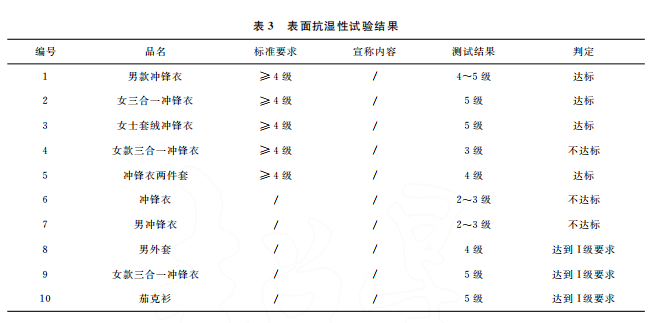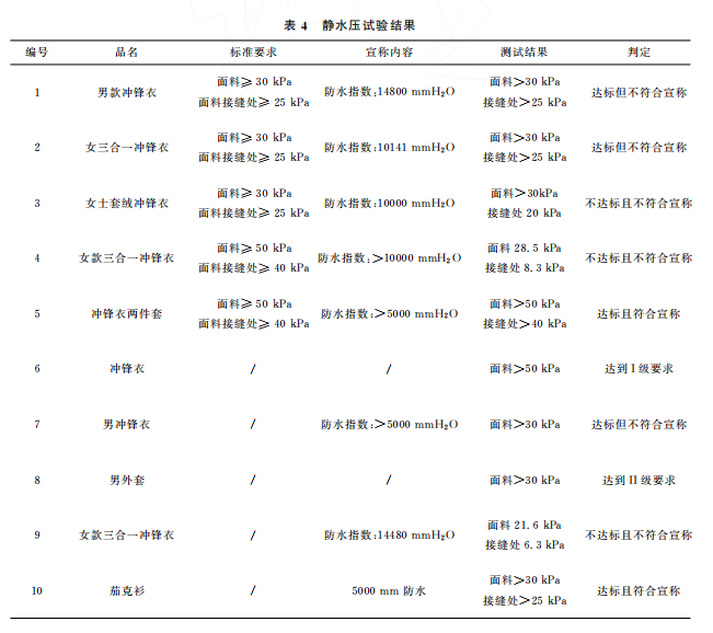 本文最終的判定是結(jié)合 GB/T32614—2016《戶外運(yùn)動服裝 沖鋒衣》中面料功能性要求和產(chǎn)品銷售時(shí)的吊牌宣稱進(jìn)行。達(dá)標(biāo)是指符合沖鋒衣的合格品 標(biāo) 準(zhǔn) 要 求,反 之 則 不 符 合。10 件 樣 品中,只有5件達(dá)標(biāo),且只有3件是符合吊牌宣稱內(nèi)容。其中,標(biāo)示了 GB/T32614—2016的沖鋒衣,有3件達(dá)標(biāo),合格率為60%。近年來,監(jiān)管部門的抽查合格率一般在80%左右。這次比較試驗(yàn)合格率偏低的原因可能是樣品量較少,樣品的價(jià)格區(qū)間比較集中,且考核了接縫處的靜水壓。值得注意的是有2件沒有標(biāo)示 GB/T32614—2016的外套,其性能都符合標(biāo)準(zhǔn)要求。此外,銷售方對靜水壓的宣稱都偏高,有3件達(dá)標(biāo)了卻不符合自身的宣稱內(nèi)容。沖鋒衣 GB/T32614—2016標(biāo)準(zhǔn) 中 I級 對 靜 水 壓 的 要 求 也 只是:面料≥50kPa和面料接縫處≥50kPa,銷售 方卻往往宣稱100kPa,甚至達(dá)150kPa,而且也沒有充分考慮到面料接縫處靜水壓值會相對偏小的現(xiàn)實(shí)。需要警 醒 的 是,5 件 標(biāo) 示 了 GB/T32614—2016的沖鋒衣其綜合宣傳都不符合規(guī)定,存在執(zhí)行標(biāo)準(zhǔn)標(biāo)注正確卻夸大宣傳的嫌疑。