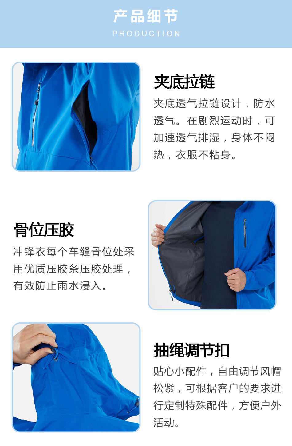 • 抽繩調節扣:貼心小配件,自由調節風帽松緊,可根據客戶的要求進行定制特殊配件,方便戶外活動。